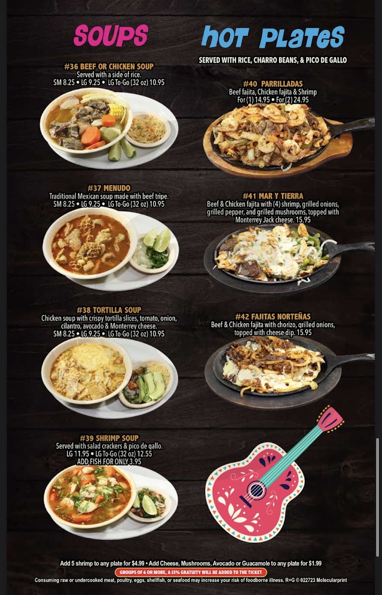 With ground beef or asada, guacamole, salad, pico de gallo & sour cream. Add chicken or beef fajita strips for an additional cost.