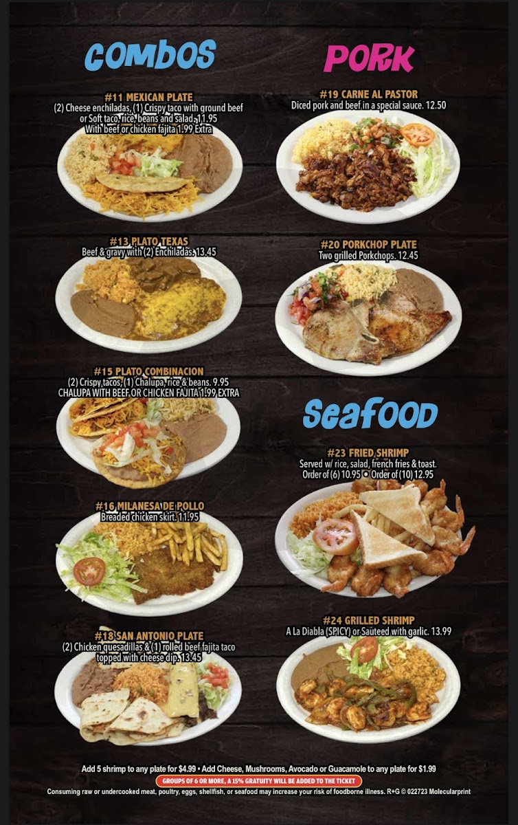 (2) cheese enchiladas, (1) crispy taco with ground beef or soft taco, rice, beans and salad. With beef or chicken fajita for an extra.
