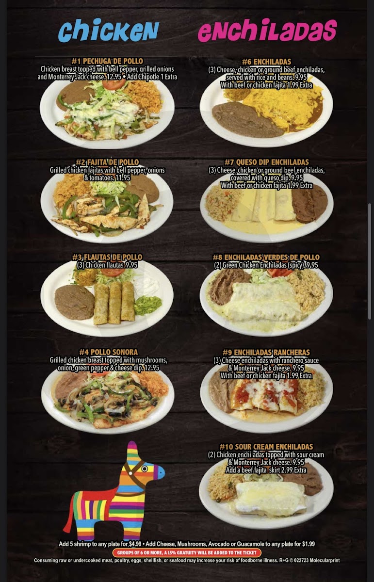 (3) cheese, chicken or ground beef enchiladas, covered with queso. With beef or chicken fajita for an extra.